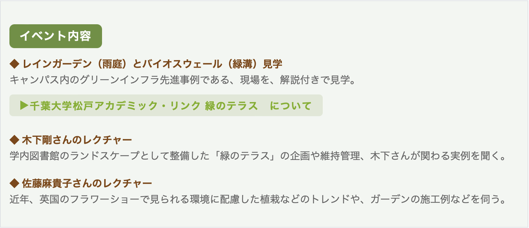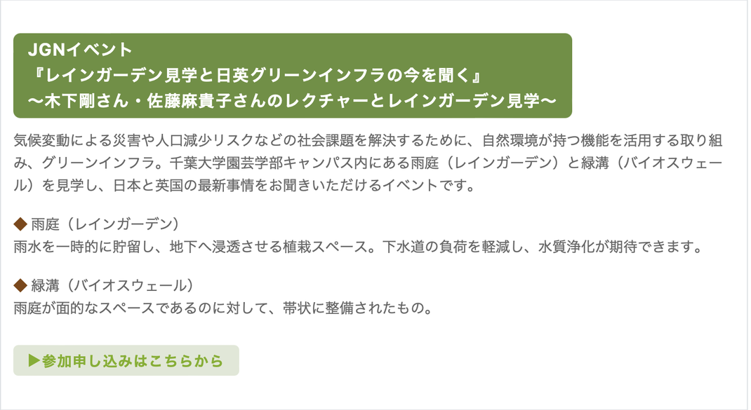 Lecture · 2025/10/08 レインガーデン見学と日英グリーンインフラの今を聞く 10/18 ⇩ ⇩ ⇩ More details & Book Tickets ⇩ ⇩ ⇩ More details & Book Tickets tagPlaceholderカテゴリ: